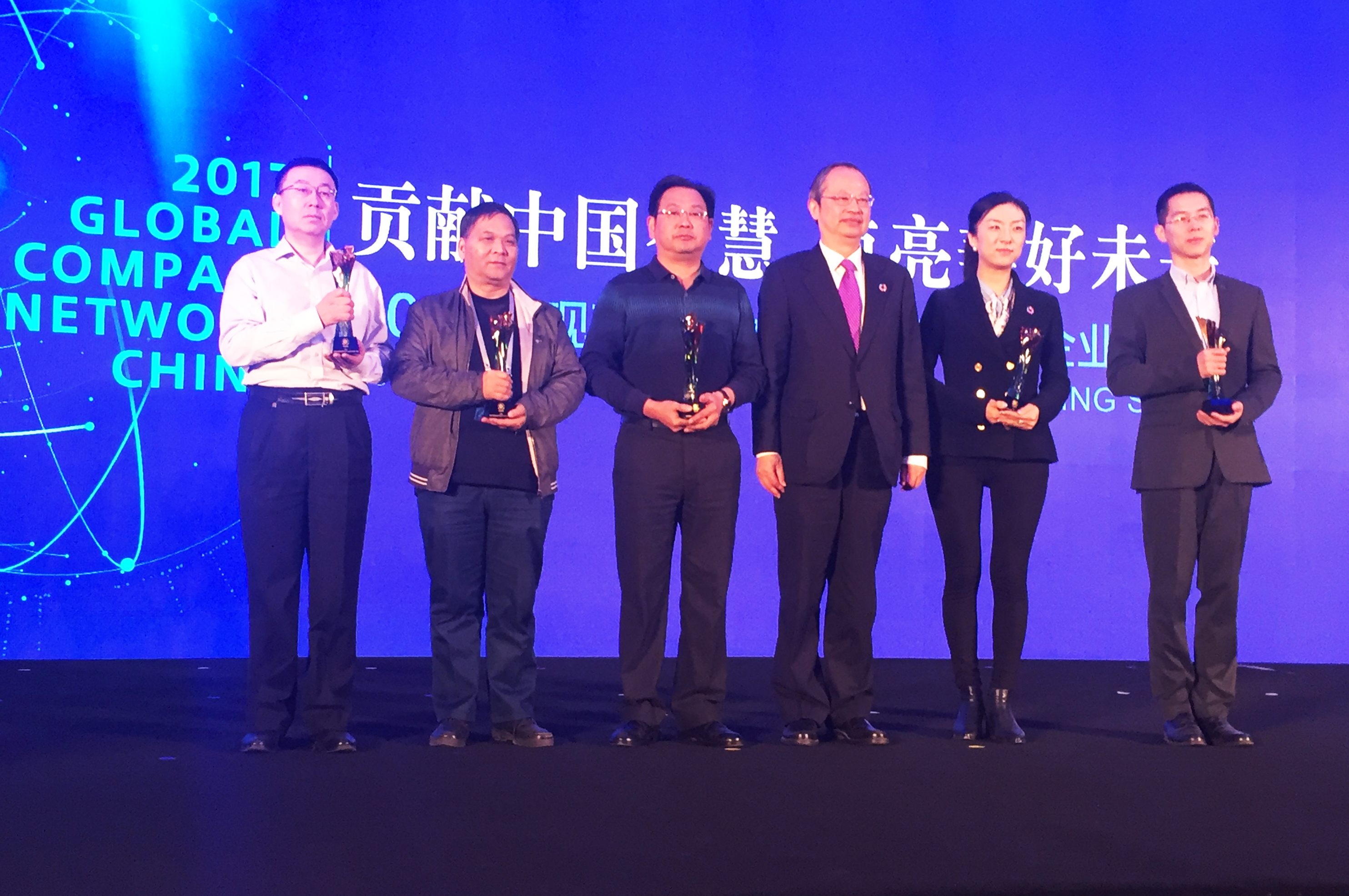 公司入選“實現(xiàn)可持續(xù)發(fā)展目標(biāo)中國企業(yè)最佳實踐”榜單,公司執(zhí)委、副總裁劉鳳山(左三)代表公司參會并上臺領(lǐng)獎。
