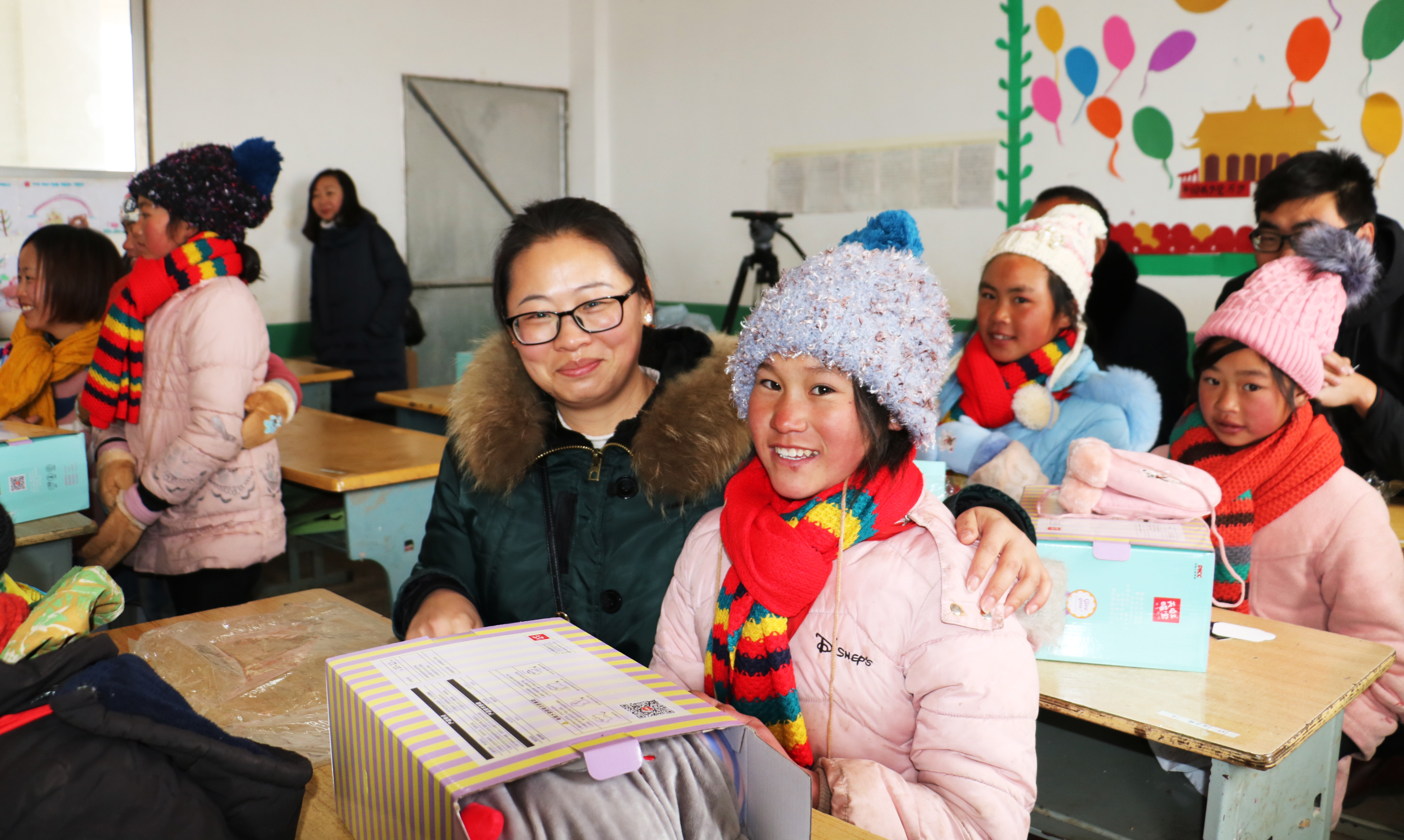 上圖均為志愿者為孩子們獻愛心,送上學習和取暖用品